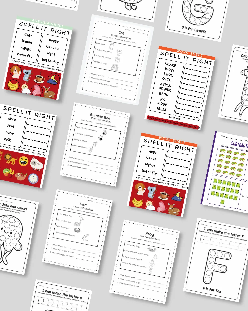 Alphabet charts, phonics worksheets, reading comprehension pages and flashcards designed to support early language development and confidence.