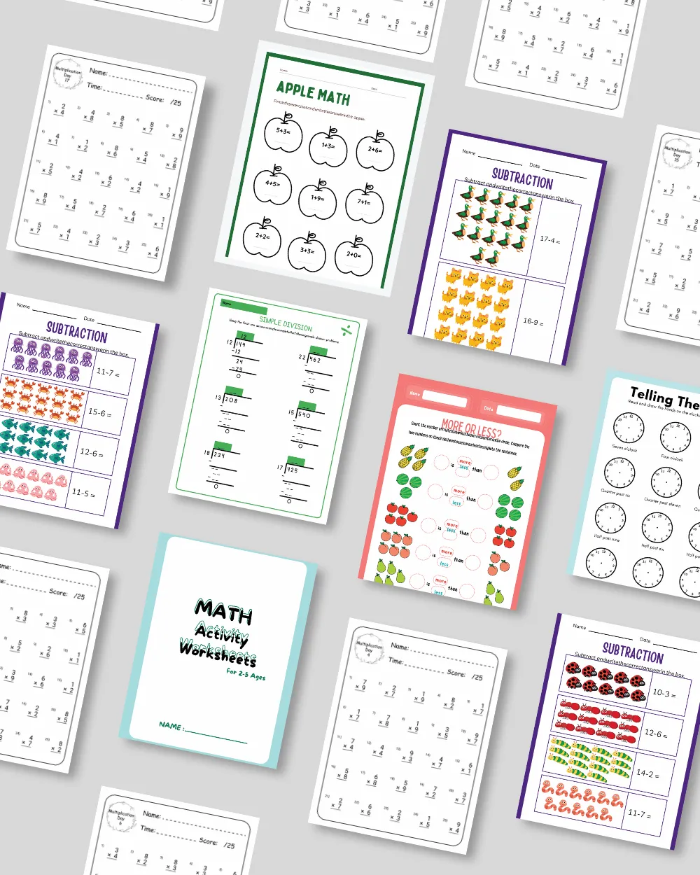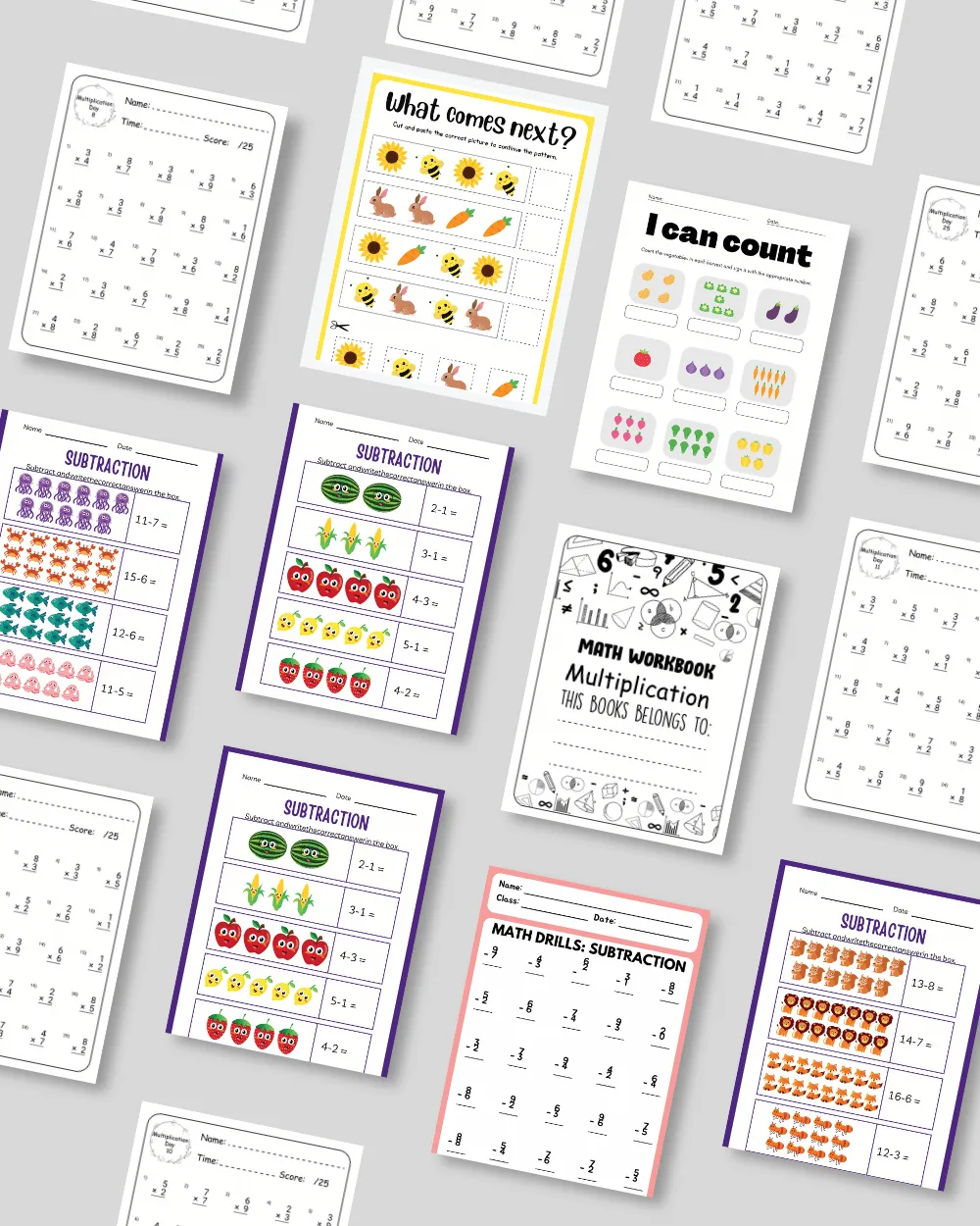 Counting worksheets, time-telling, number recognition activities, simple addition and foundational math exercises designed to build confidence with early number skills.